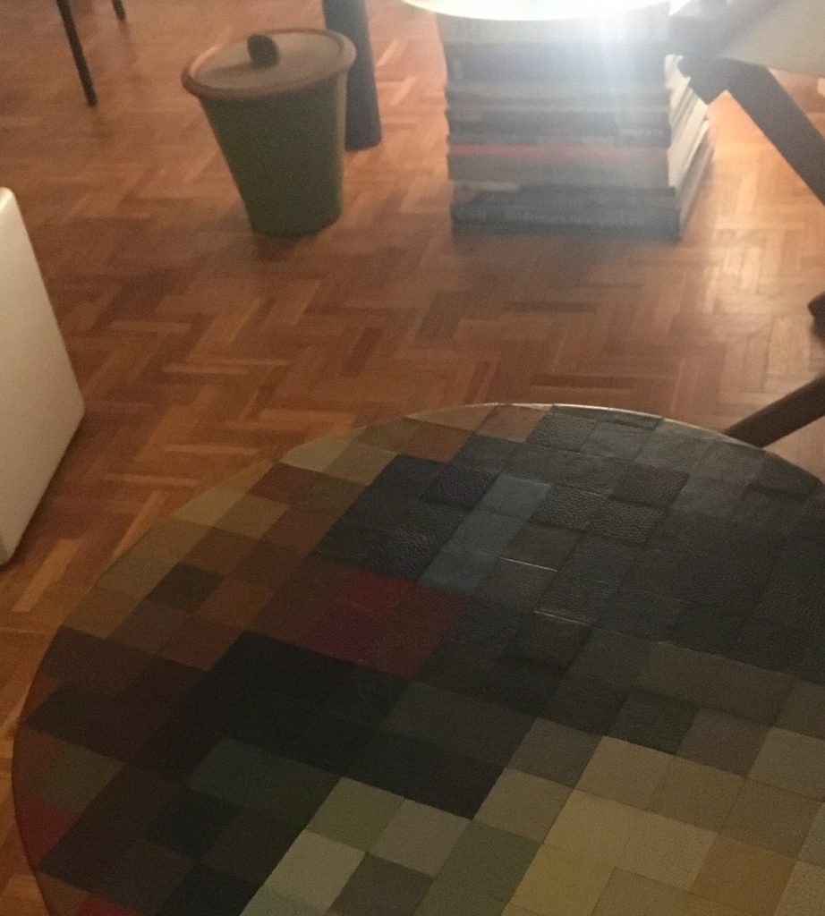 Pour interroger la place de la photographie, un détail qu’elle peut nous rappeler, et ici faire oublier un sol existant trop présent. Plateau de table basse en mosaïque de cuir (Photographie du modèle zéro réalisé à la main avec des chutes de cuir d’épaisseurs variables – Ø 55 cm – piètement à découvrir).
