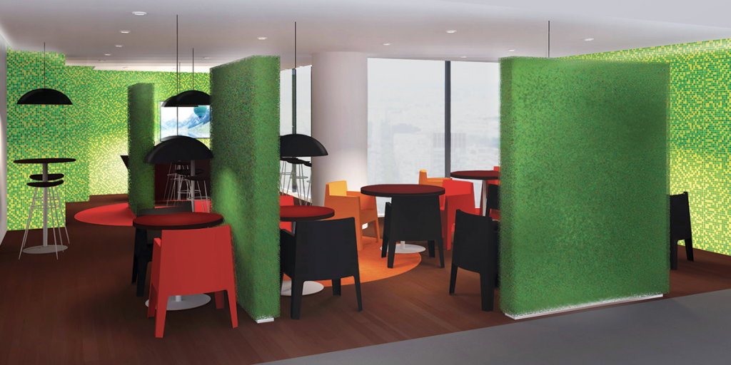 Intervention d’urgence pour la conception de l’espace d’accueil et la cafétéria. Étude et implantations de différentes configurations, tendances mobilier et intentions pour la décoration (2 plateaux 800m2).