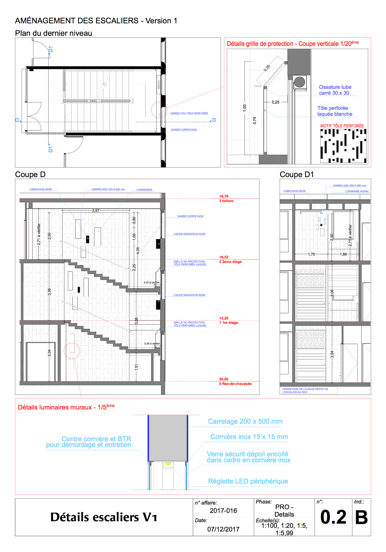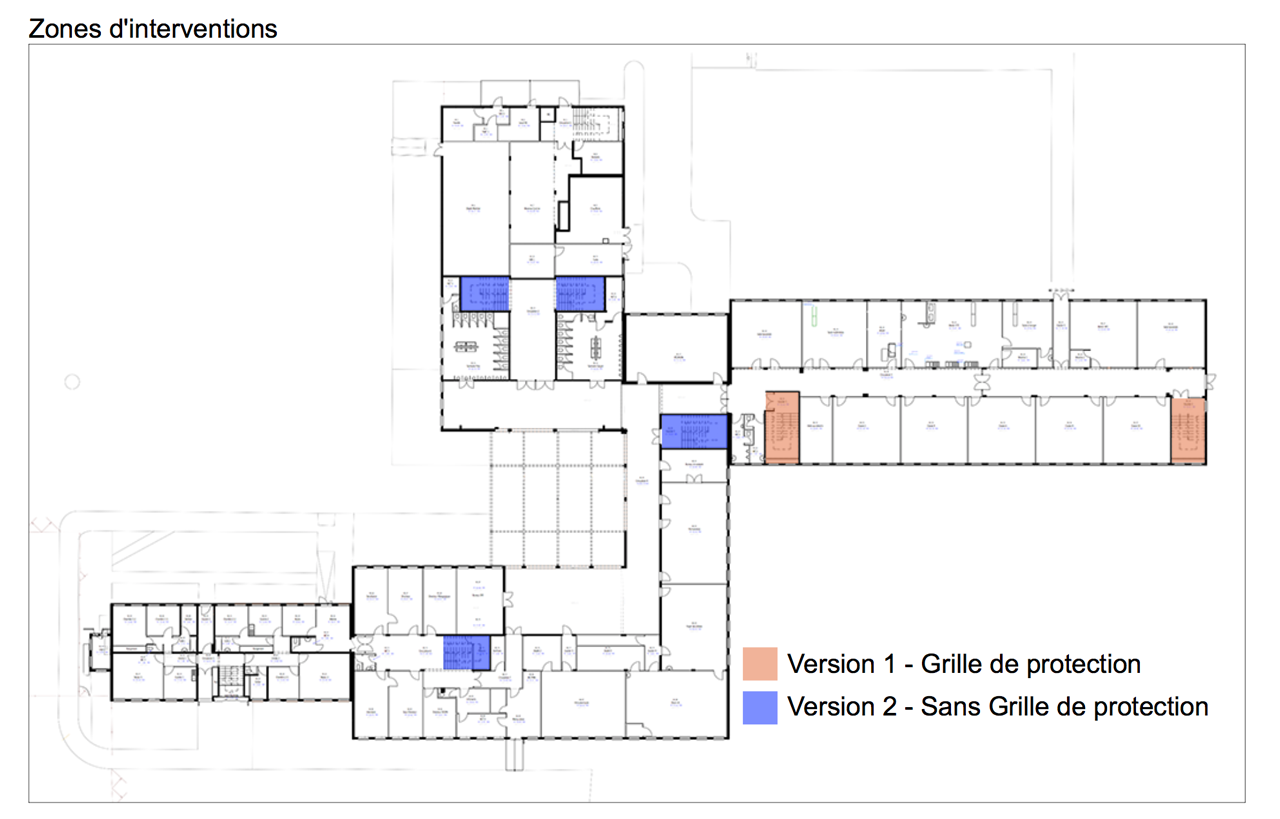 Principe de rénovation pour la mise en conformité des escaliers d’un collège. Un éclairage sera intégré aux murs d’échiffre nouvellement créé, une reprises des sols, murs, plafonds, le remplacement des gardes corps et la pose de tôle ajourées de protection.