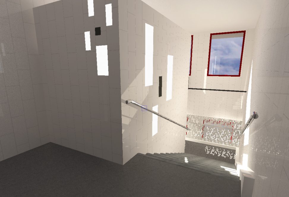 Principe de rénovation pour la mise en conformité des escaliers d’un collège. Un éclairage sera intégré aux murs d’échiffre nouvellement créé, une reprises des sols, murs, plafonds, le remplacement des gardes corps et la pose de tôle ajourées de protection.