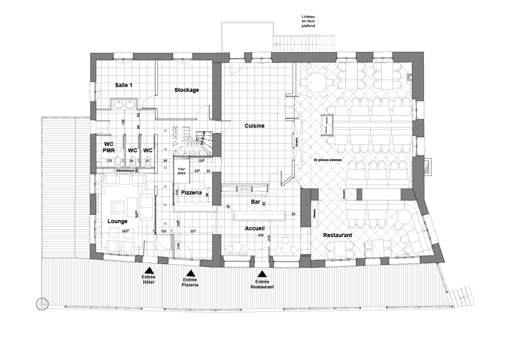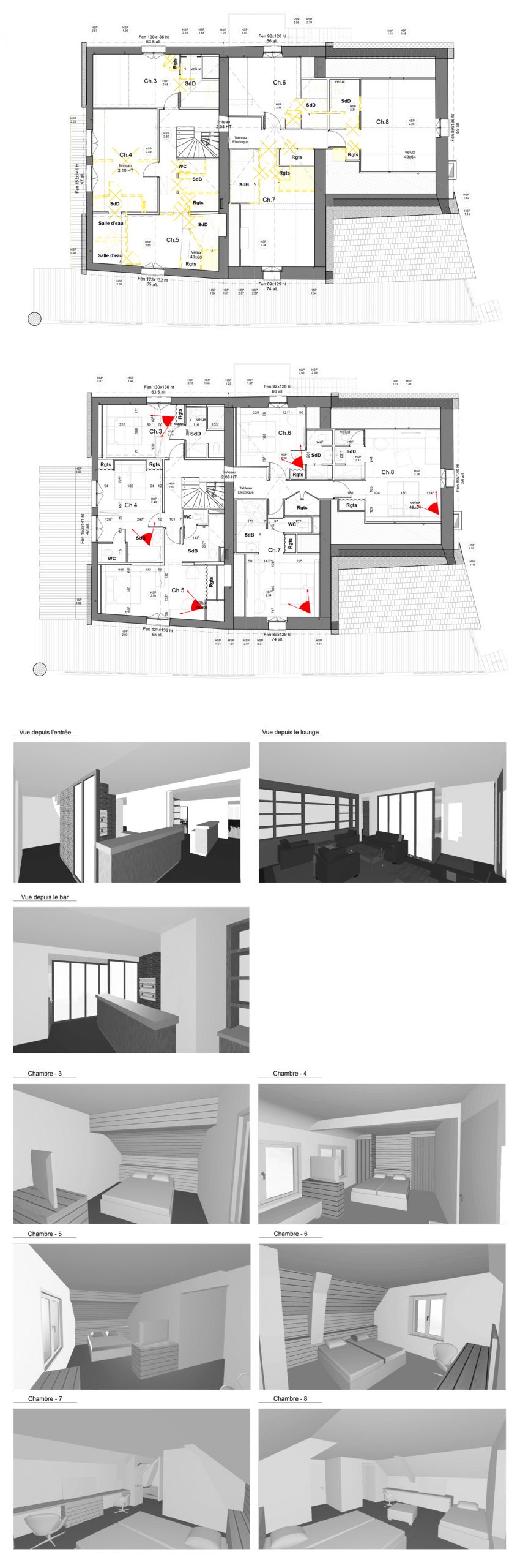 En phase esquisse et APS, une collaboration pour la rénovation d’un hôtel restaurant** et ses huit chambres. Plans existants, projetés et 3D Archicad.