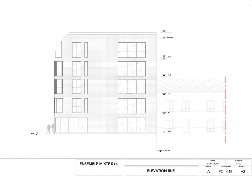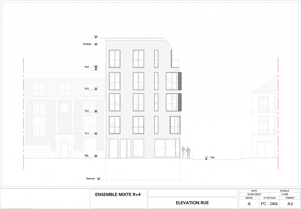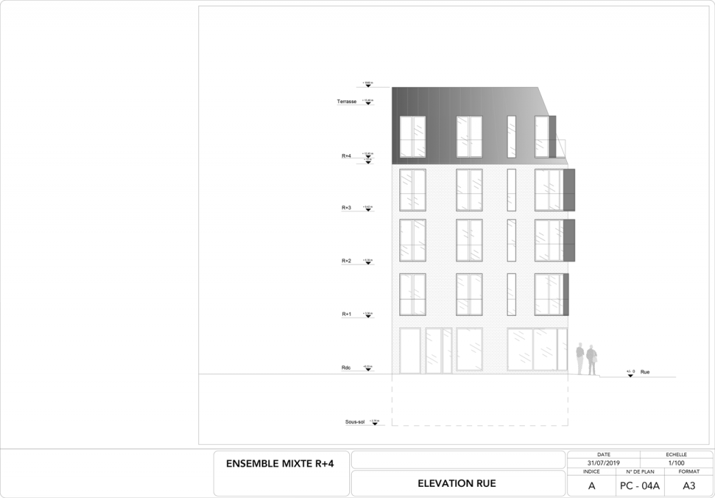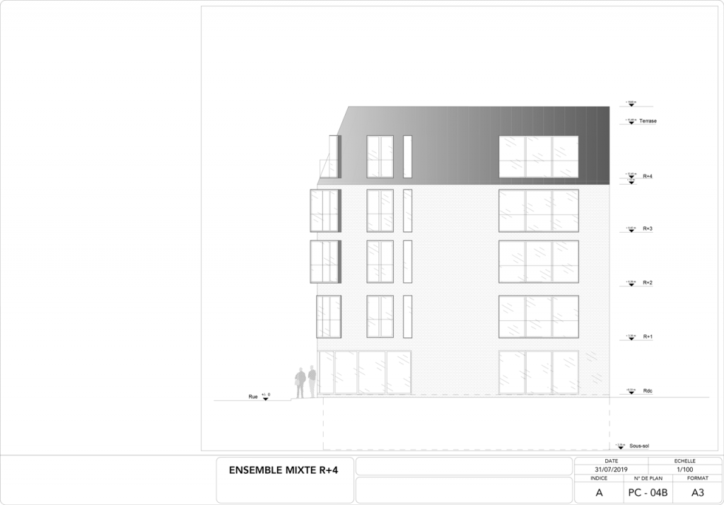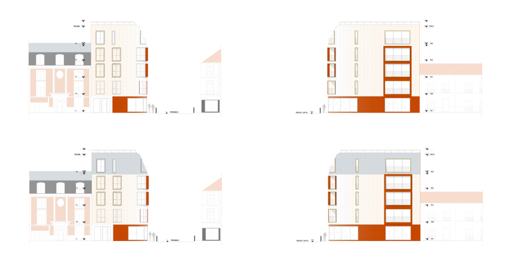 Recherches pour une façade en questionnement entre PC et esquisse. Amélioration des intérieurs de deux appartements envisagés aux derniers niveaux et variante sous forme de duplex.