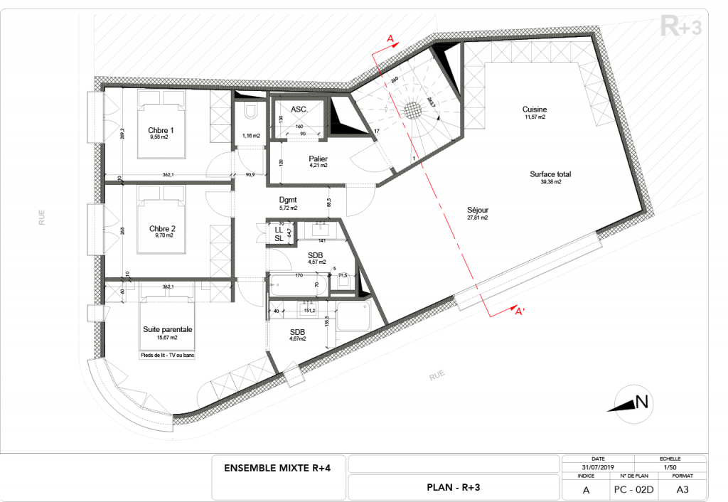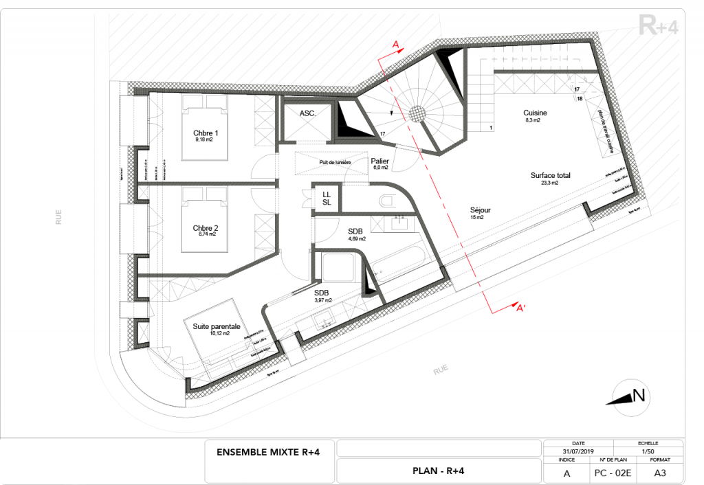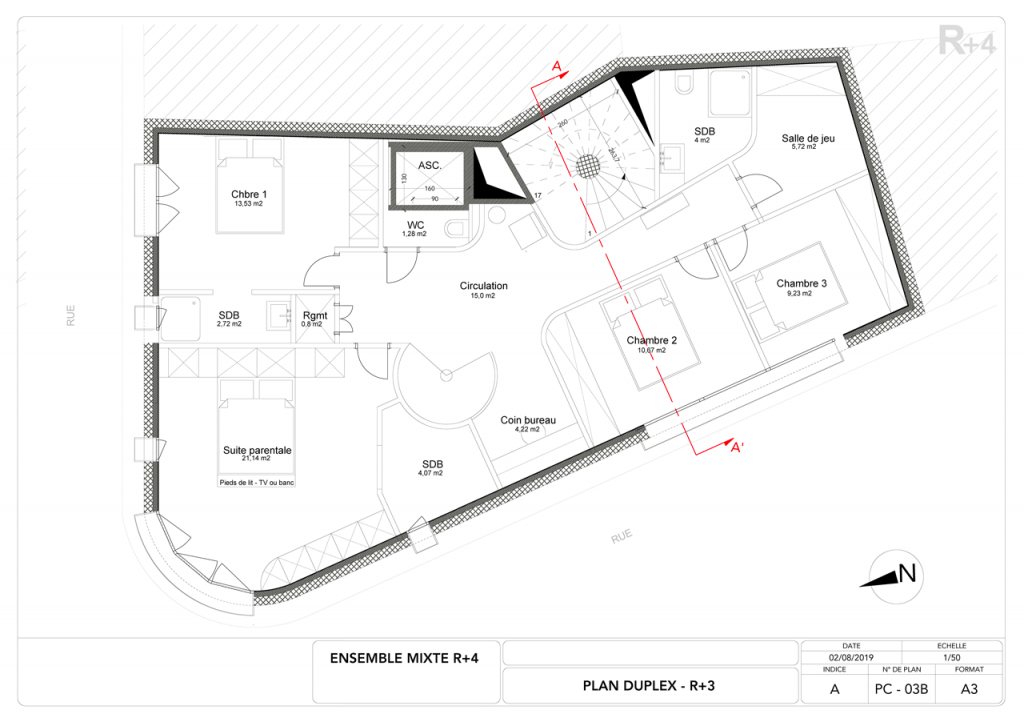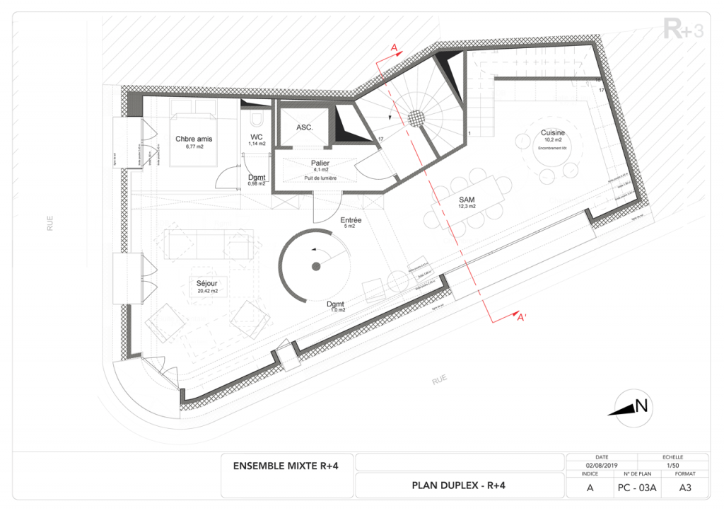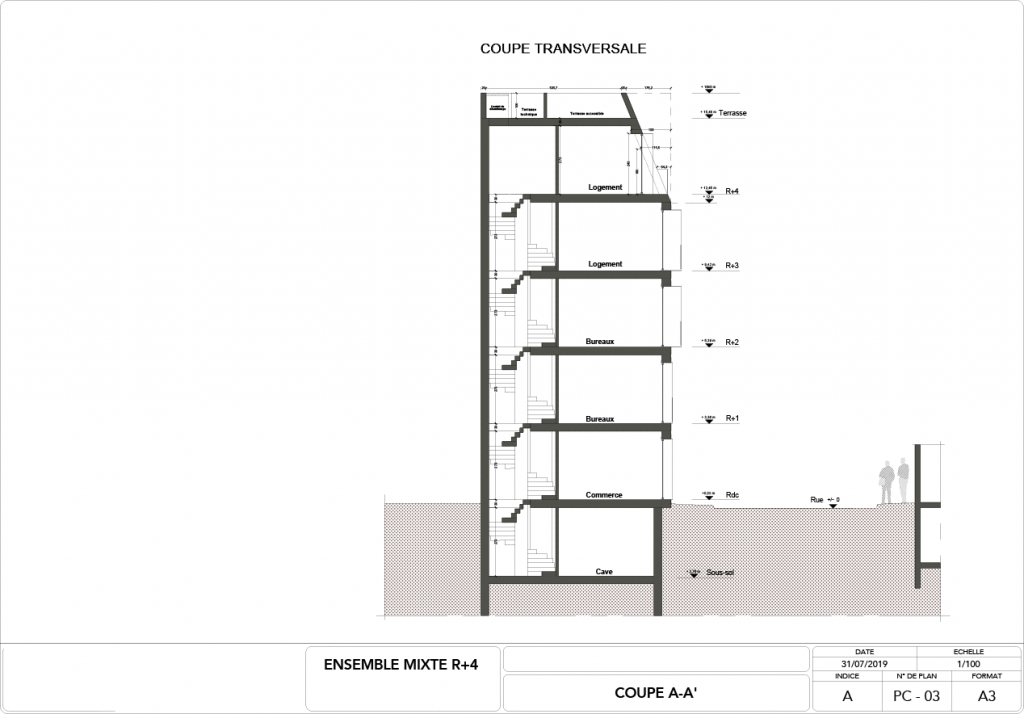 Recherches pour une façade en questionnement entre PC et esquisse. Amélioration des intérieurs de deux appartements envisagés aux derniers niveaux et variante sous forme de duplex.